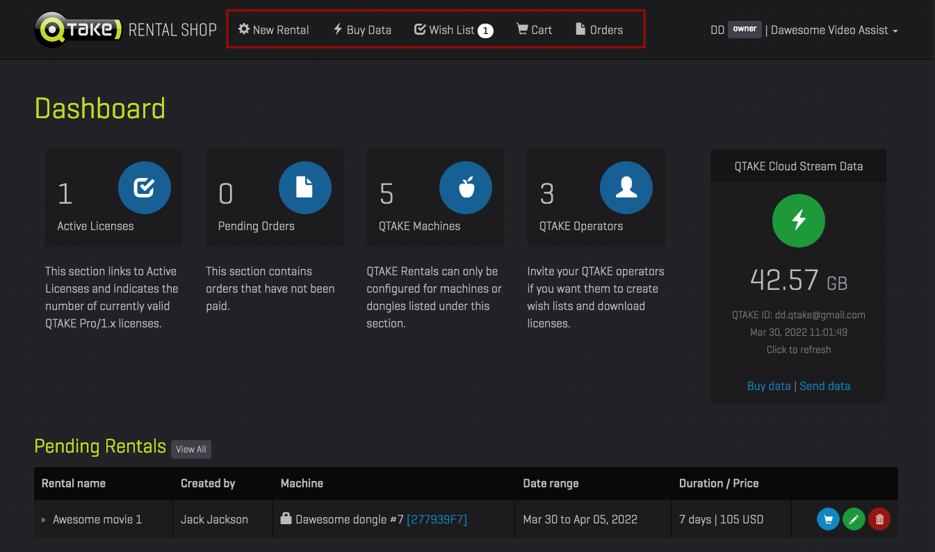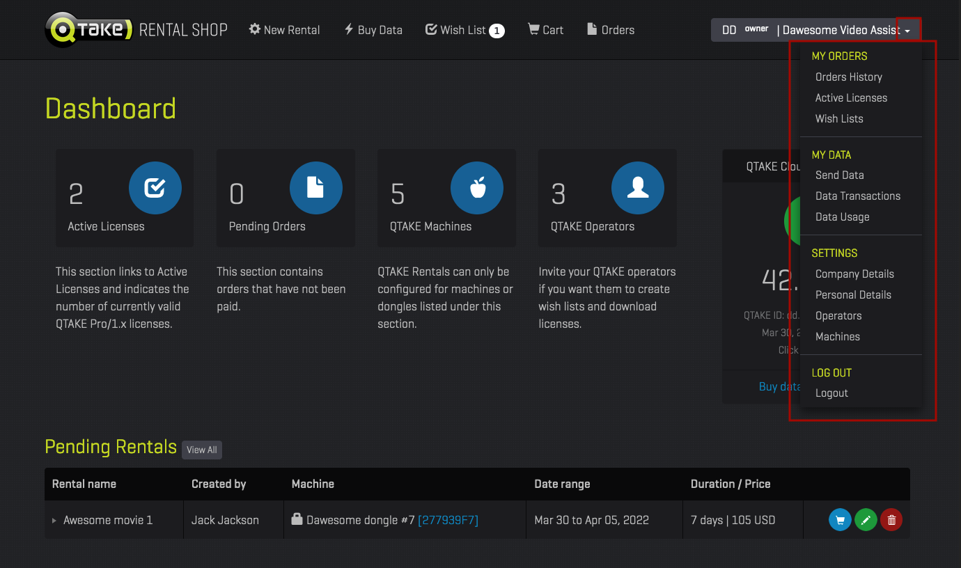 または QTAKE Pro、QTAKE 1.x、QTAKE Server の新規レンタルライセンスを購入したい、あるいはレンタル費用の計算のみをしたい場合は、ここから始めます。QTAKE Pro レンタルの構成を始めるには、あらかじめ QTAKE オペレーターを招待し、招待を受け入れてもらう必要があります。QTAKE 1.x の新規レンタルまたは QTAKE Server のレンタルの構成を始めるときは、QTAKE マシンが登録されていることを事前に確認してください。レンタルの手続きの中で、モジュール、開始日、終了日を選択すると、レンタル価格がリアルタイムで計算され、表示されます。それを確認した後で、ウィッシュリストまたはカートに、レンタル構成を追加します。
