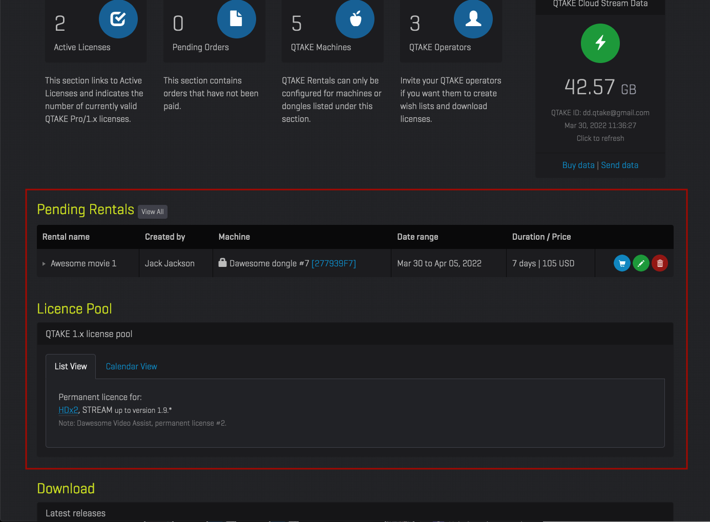 Dashboard (ダウンロード)の下部には、最新の公式 QTAKE (Pro および 1.x)および QTAKE Server リリースへのリンクが含まれています。デモ版(NFR とも表記されています)をダウンロードして、ソフトウェアを評価したり、ご希望であれば試用することもできます。画像にはウォーターマークが入り、商用には利用できません。また、プロジェクトあたり 30 クリップまでなど、いくつかの制限が適用されます。